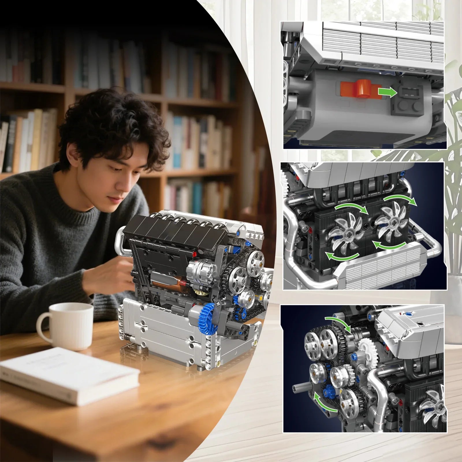 Een volledig werkend tandwiel- en kettingaandrijfsysteem brengt de zuigers, krukas en nokkenassen in beweging, terwijl de voorste tandwielen en dubbele koelfans synchroon meedraaien voor een realistische motorsimulatie.