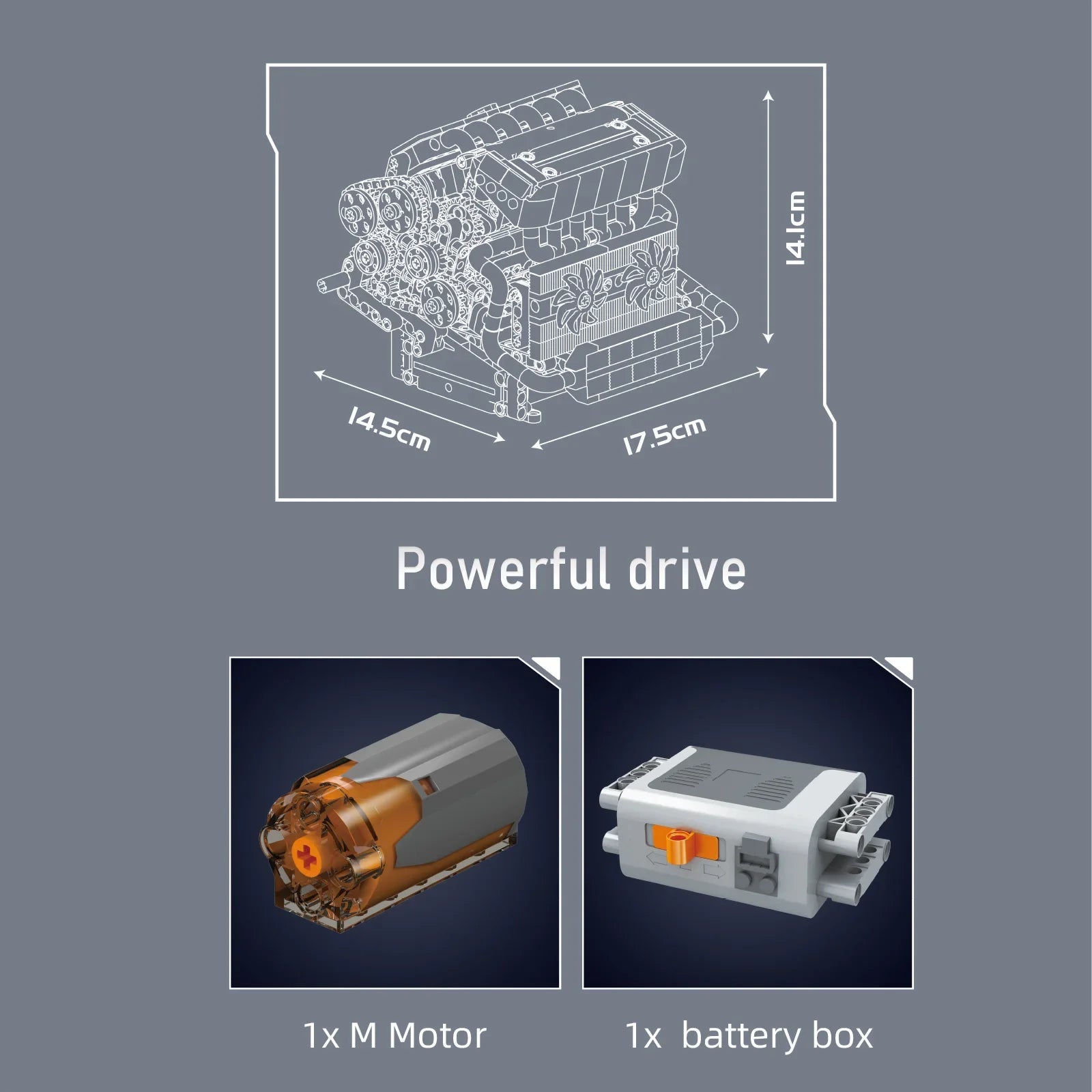 Dankzij de meegeleverde M-motor en batterijbox komt het model écht tot leven. Schakel de stroom in en kijk hoe de tandwielen draaien en de fans ronddraaien — een indrukwekkende demonstratie van mechanische kracht en precisie.