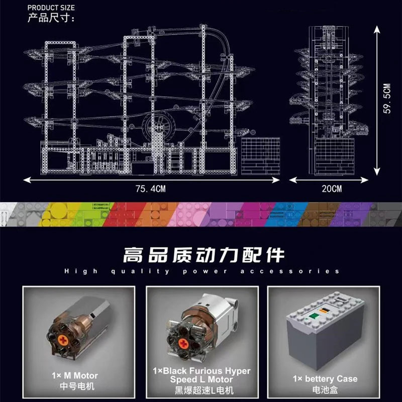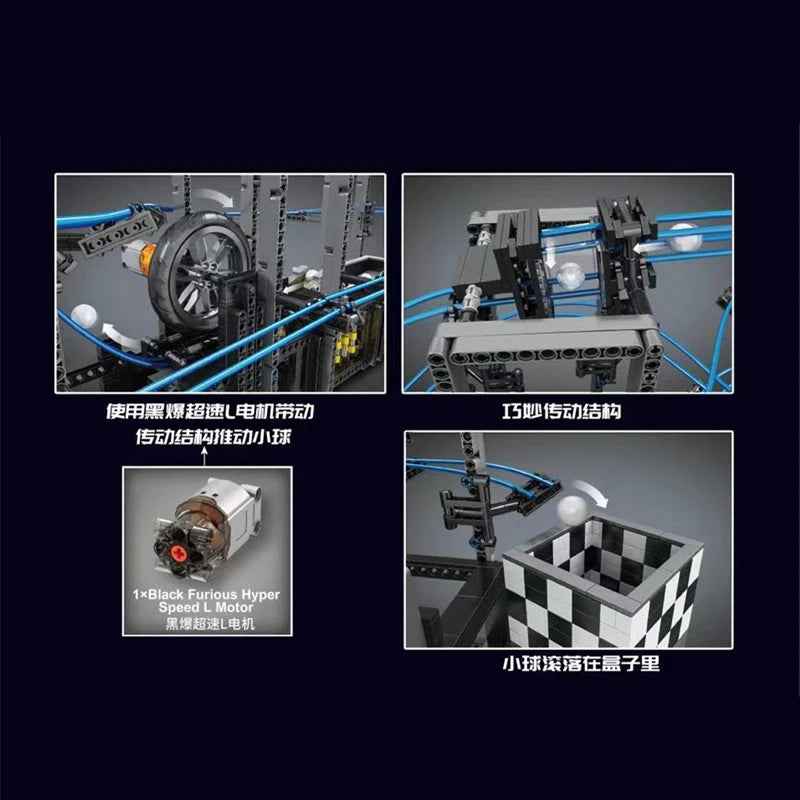 Deze marmeren achtbaan wordt aangedreven door een hyperspeed-motor, inclusief 1× M-motor, 1× lithiumbatterij, 9 baller-kogels en een grote hoeveelheid bouwstenen. De constructie is stabiel, het uiterlijk gedetailleerd en zorgt voor uren bouwplezier. Het model stimuleert creativiteit, hand-oogcoördinatie, probleemoplossend vermogen en zelfvertrouwen bij kinderen.